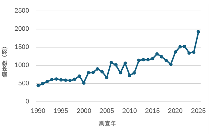 個体数の推移グラフ/北海道によるタンチョウ個体数調査結果(各年度1月の第二回調査)より作図