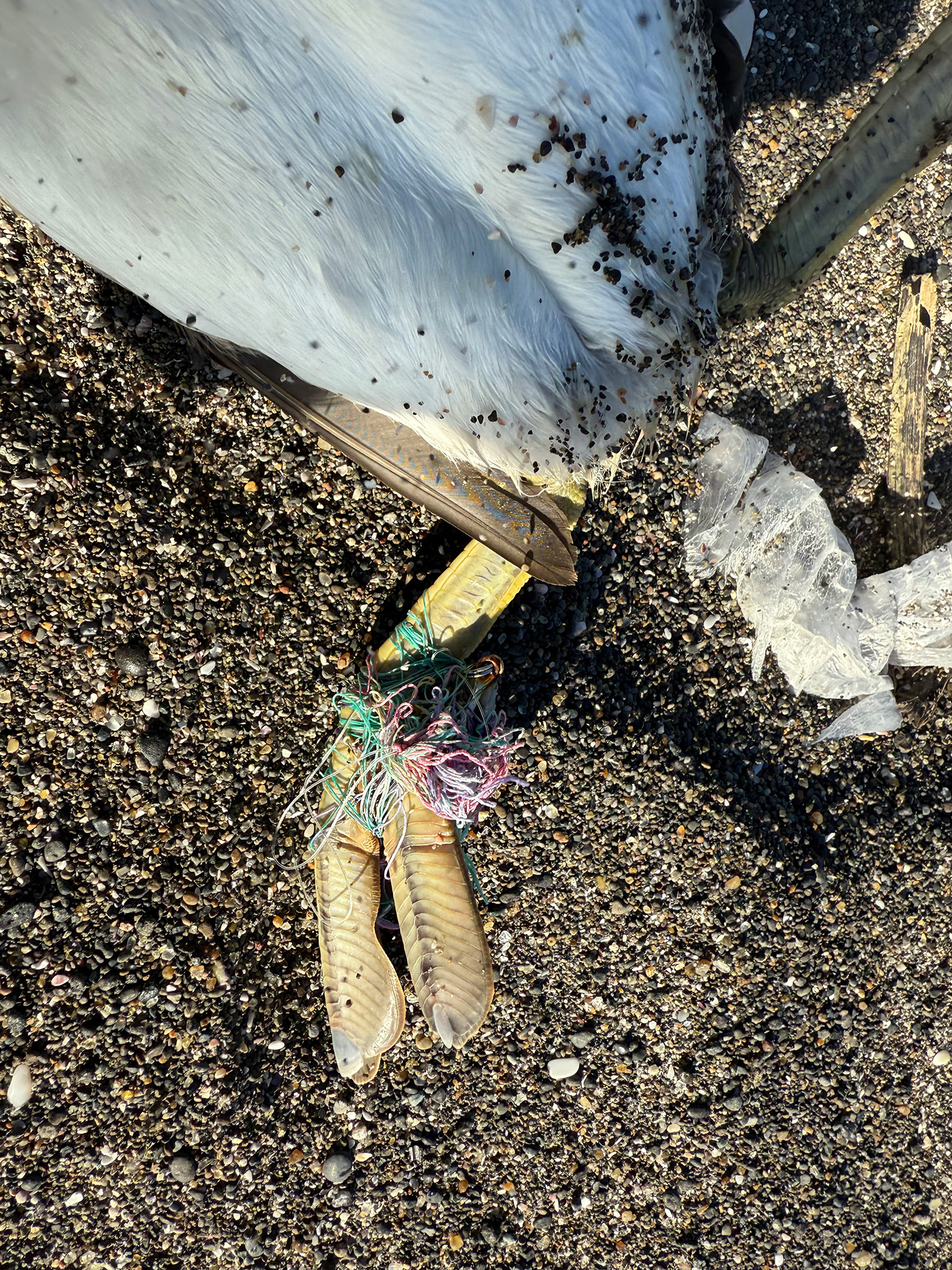 - 右の翼に投げ釣りの仕掛けが絡まっていた。
