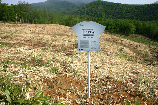 今回のキャンペーンでは、「シマフクロウの森を育てよう!プロジェクト」の1区画分(500㎡)を「千人の森キャンペーン区画」とし、広葉樹の苗木100本を植樹、キャンペーンを象徴するTシャツ型の看板を設置しています。