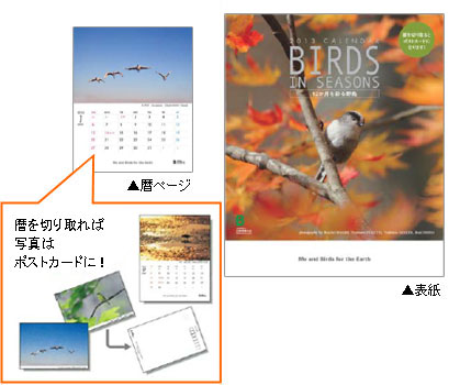 『ワイルドバード・カレンダー』(壁掛)と、『BIRDS IN SEASONS卓上カレンダー』の2種類を制作。いずれも日本各地の様々な自然と野鳥たちの魅力が存分に詰まったカレンダーです。この販売収益は、日本野鳥の会のすすめる様々な自然保護活動に有効に活用されます。