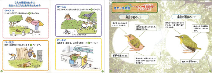 お子様にも楽しんでいただけるように、出会う場面ごとの対処方法とともに、野鳥の子育ての話やクイズも掲載しました。ご希望の方には無料でプレゼントいたします。